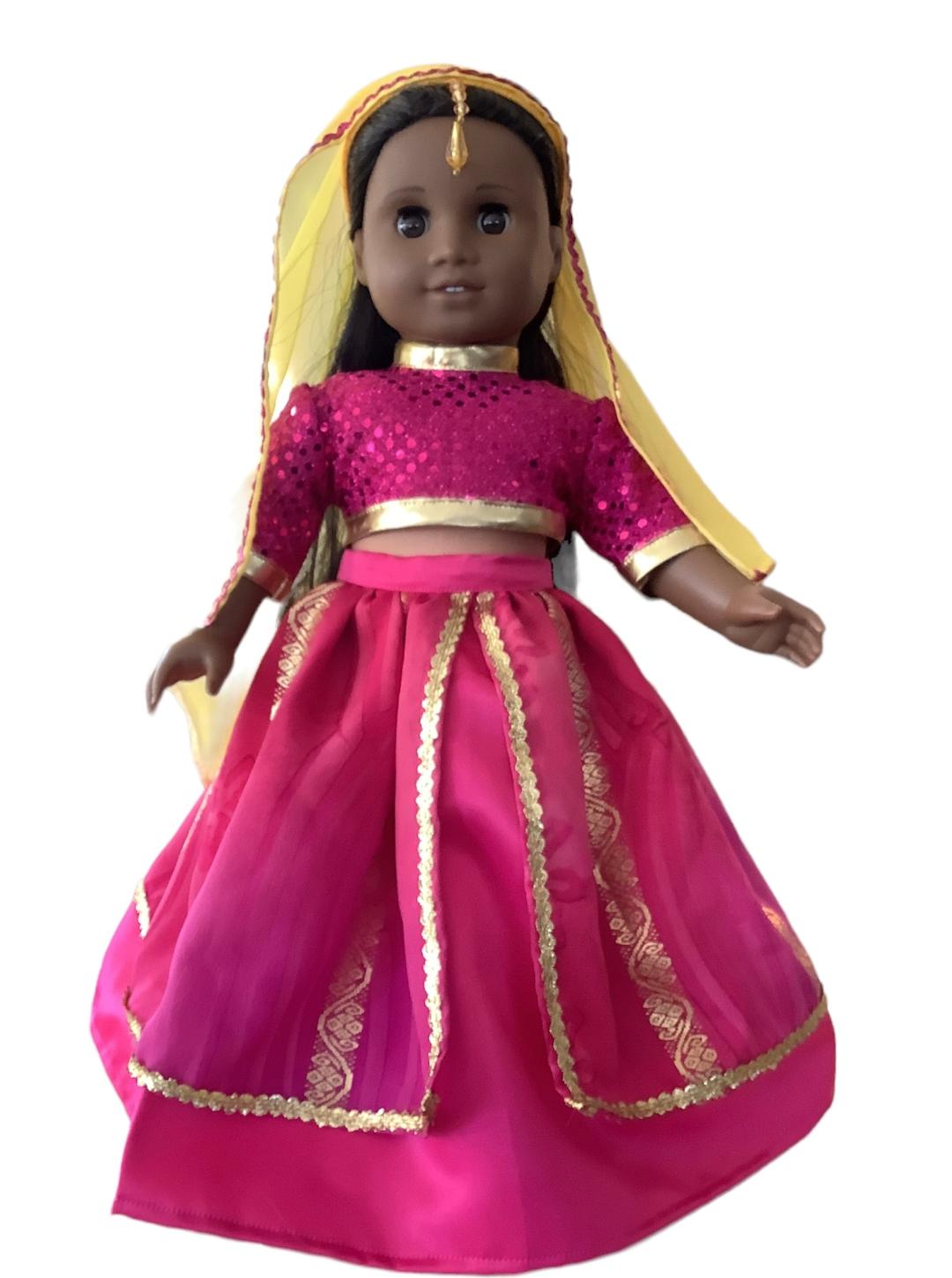Your doll will look spectacular in our Bollywood inspired ensemble. The skirt is satin with a coordinating sari print overskirt. The choli is sequinette fabric trimmed in gold, and the headband features a veil and beading.