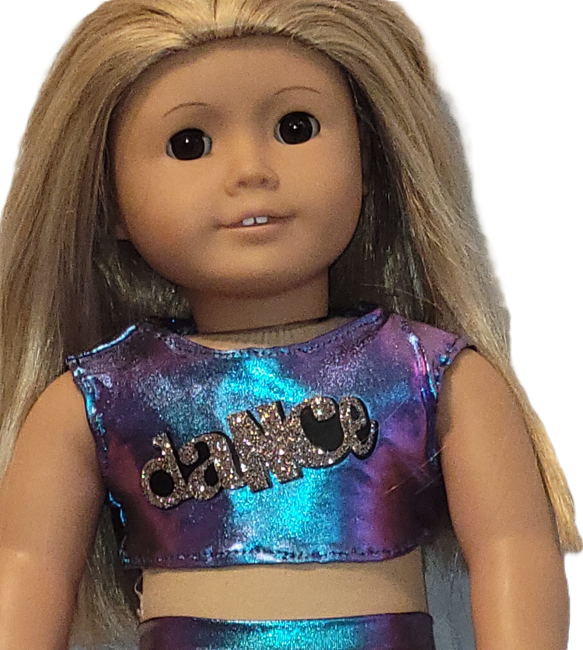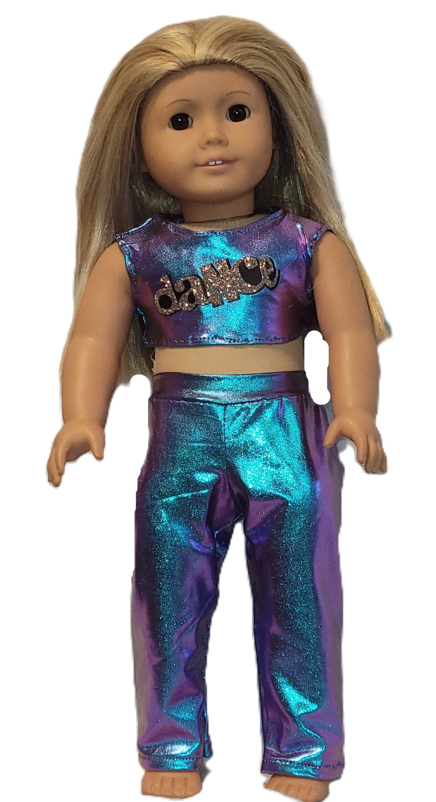Whether jazz or hip hop, your doll will be ready to dance in this two piece set of loose pants and a cropped top, made of metallic foil spandex and embellished with the word dance in silver glitter iron-on vinyl.