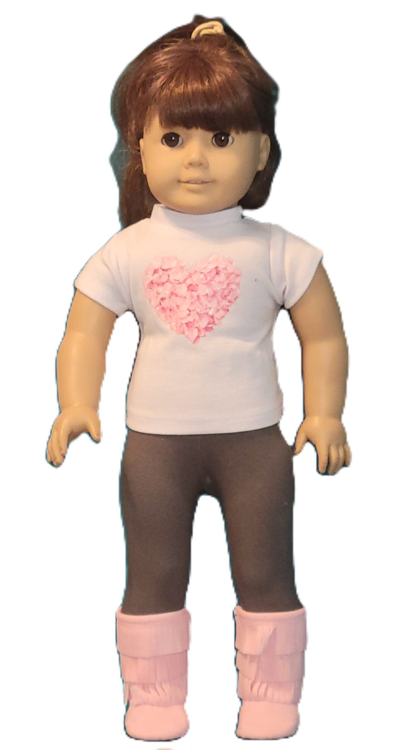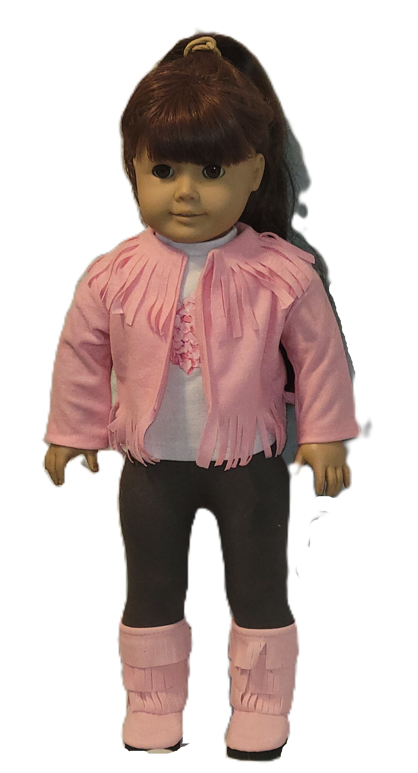 This set features a fringed jacket made of pink alova suede, a white tee with a floral heart design, grey jeggings, and pink fringed boots.