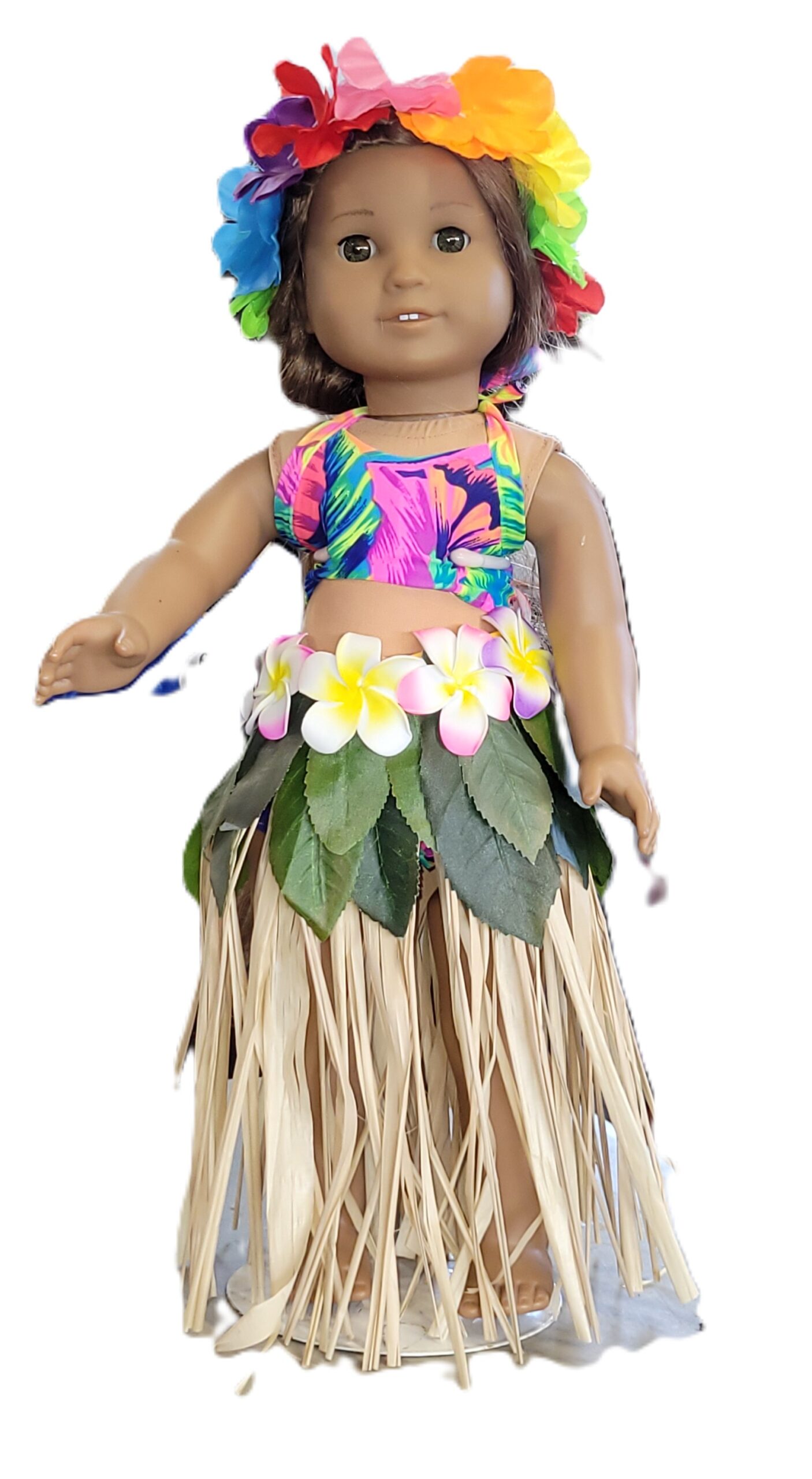 Our Hawaiian luau outfit features a vibrant print two piece swimsuit, a raffia skirt with a leaf and flower hip belt (all one piece) and a hibiscus flower headpiece. Aloha!