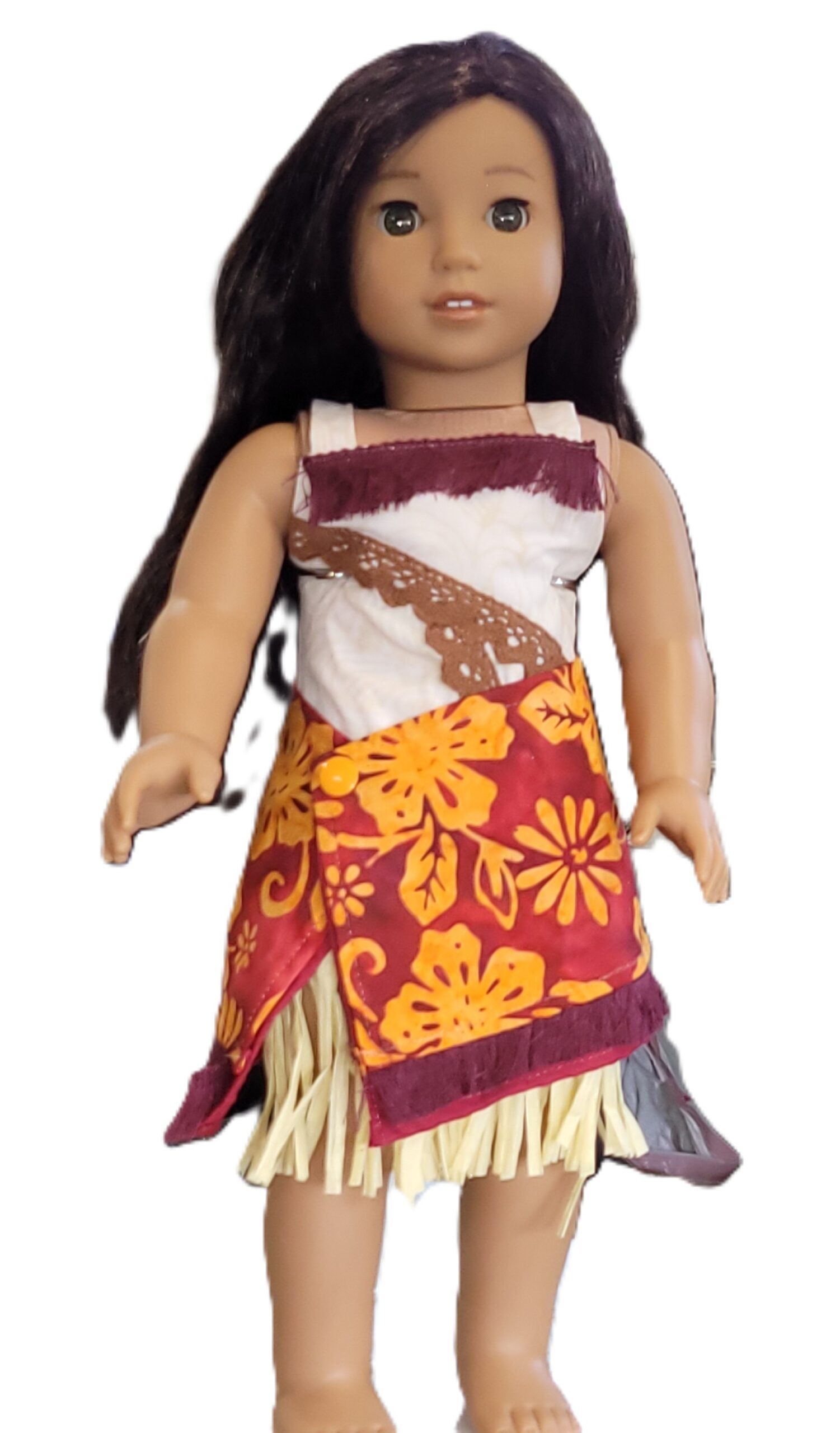 Our Island girl is ready for adventure in a grass skirt with a batik and solid overskirt, trimmed in dark burgundy fringe. The top is a pale batik trimmed in brown lace and dark burgundy fringe.