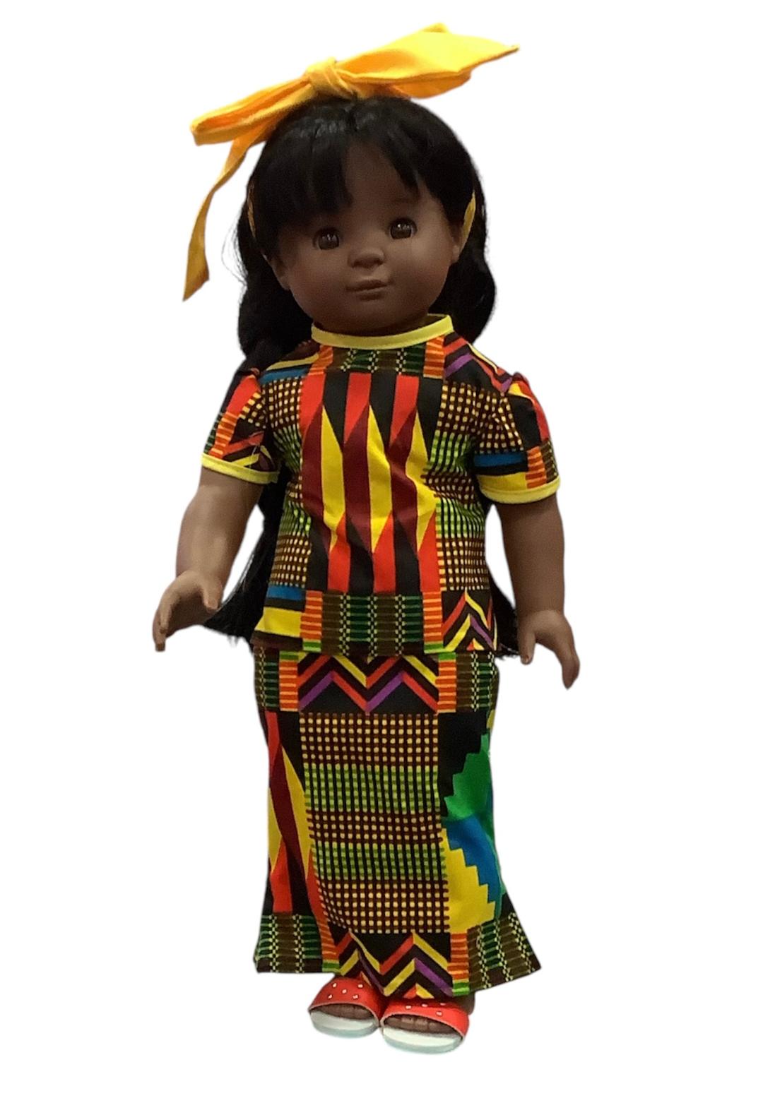This vibrant set is made of traditional Kente cloth and has a long, mermaid style skirt with a flaired short sleeve top. A yellow headwrap, shown here in a large wrapped bow, is included.