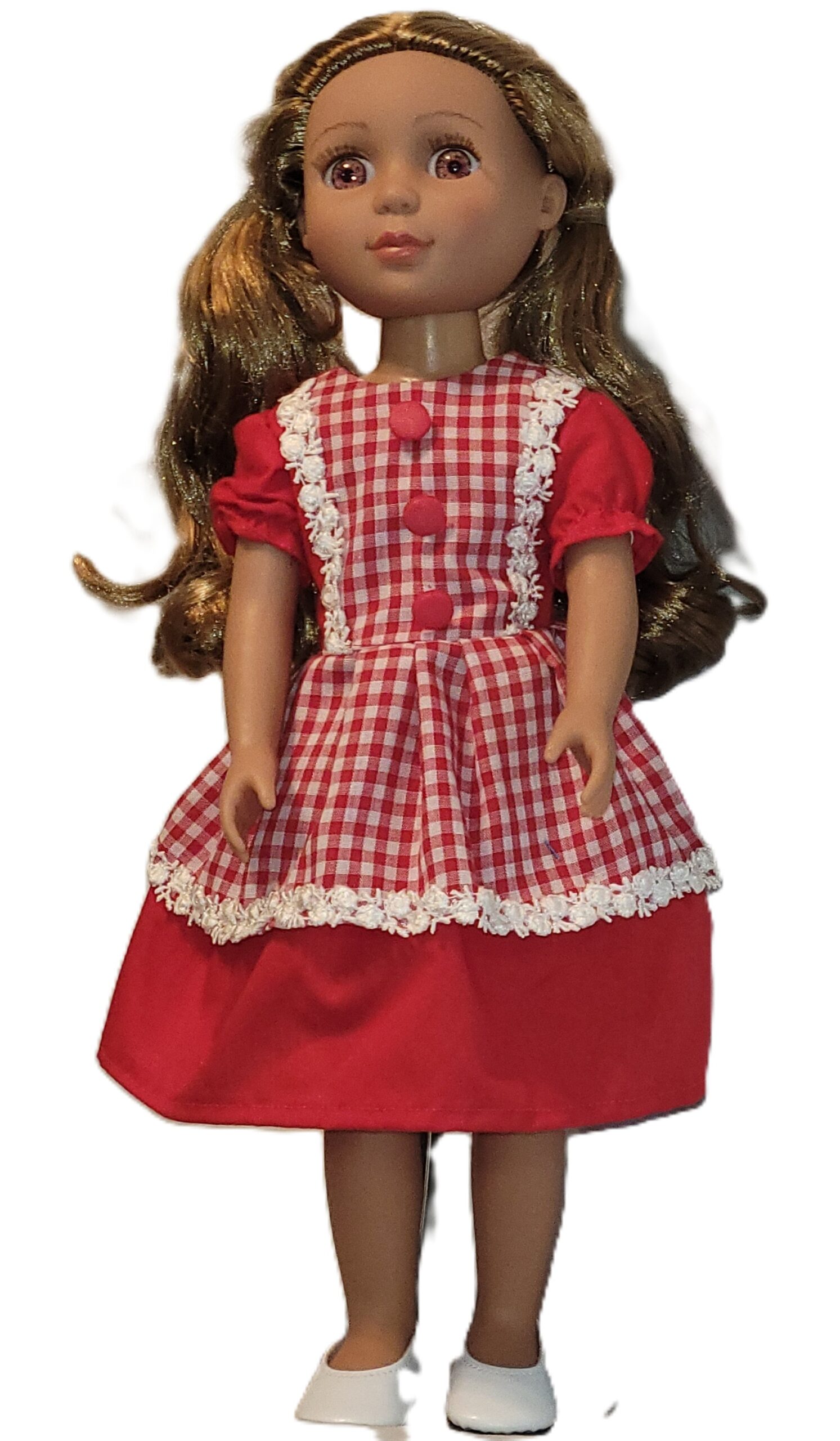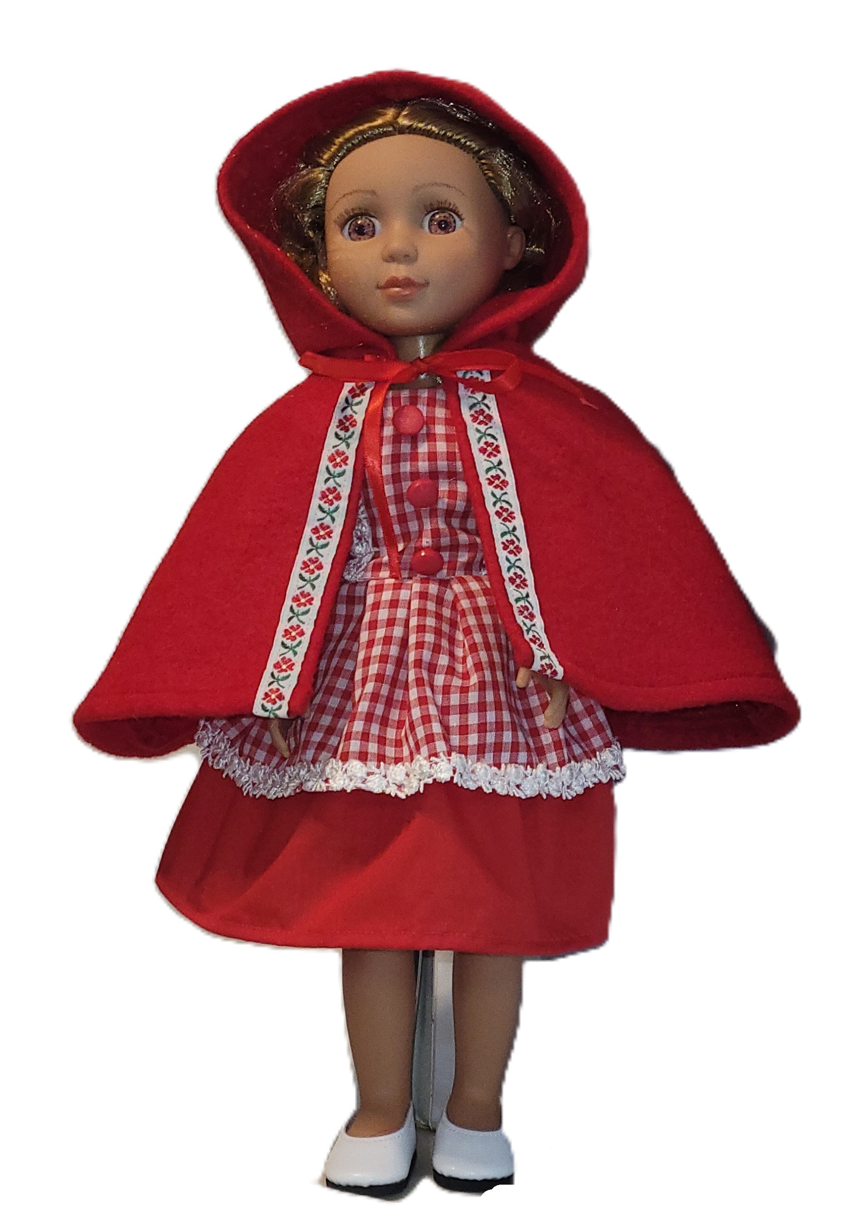 Your 14" doll is ready to go to grandmother's house in our Little Red Riding Hood costume. The cape is red felt trimmed with a floral trim. The dress is red cotton with red gingham, a sweet flower trim, and red buttons. Shoes sold separately.