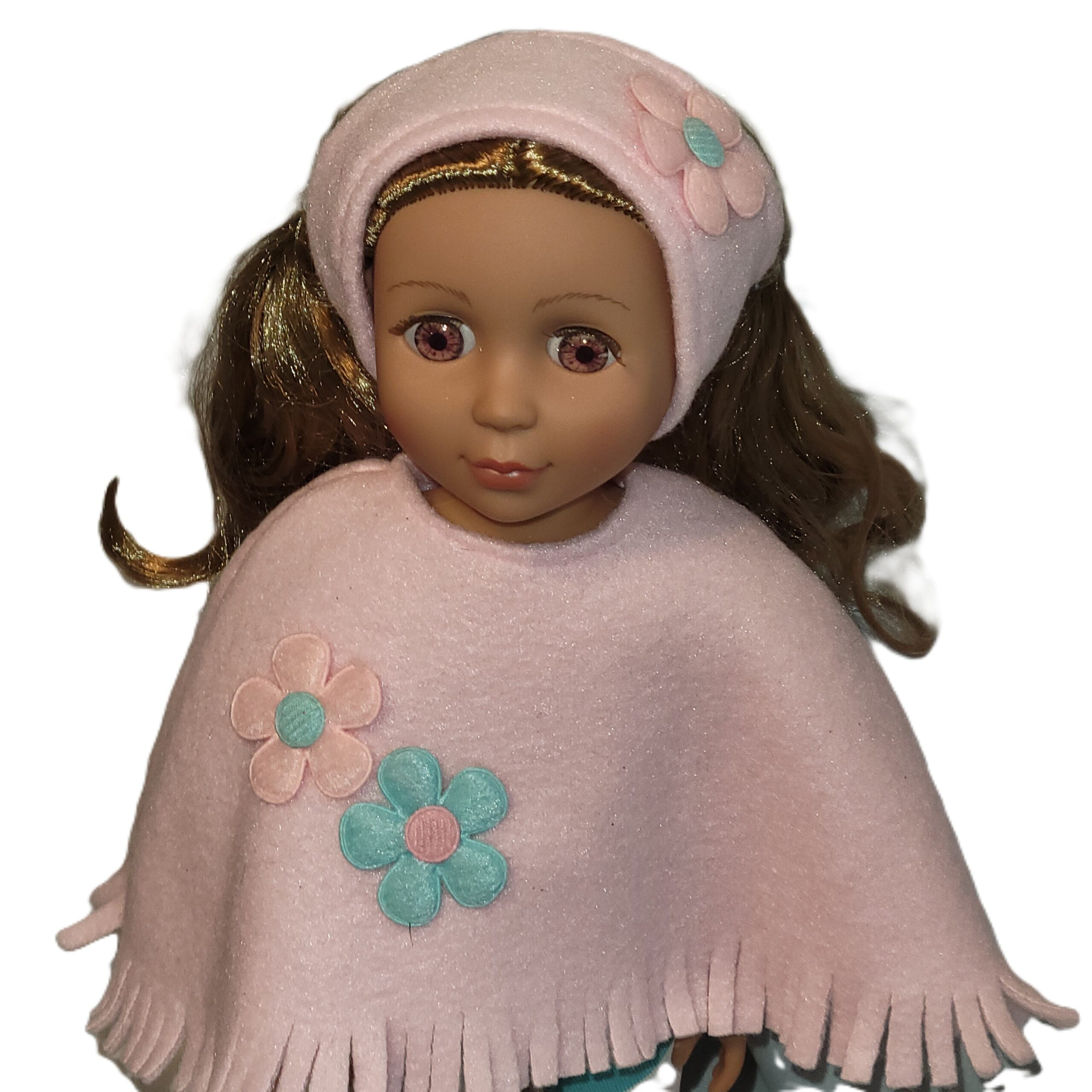 Perfect for a chilly day, our poncho set features jeans in a pink, aqua, and white chevron print, a pink fleece poncho with a fringed hem and flower embellishments, along with a pink fleece headband with another flower. Shoes sold separately.