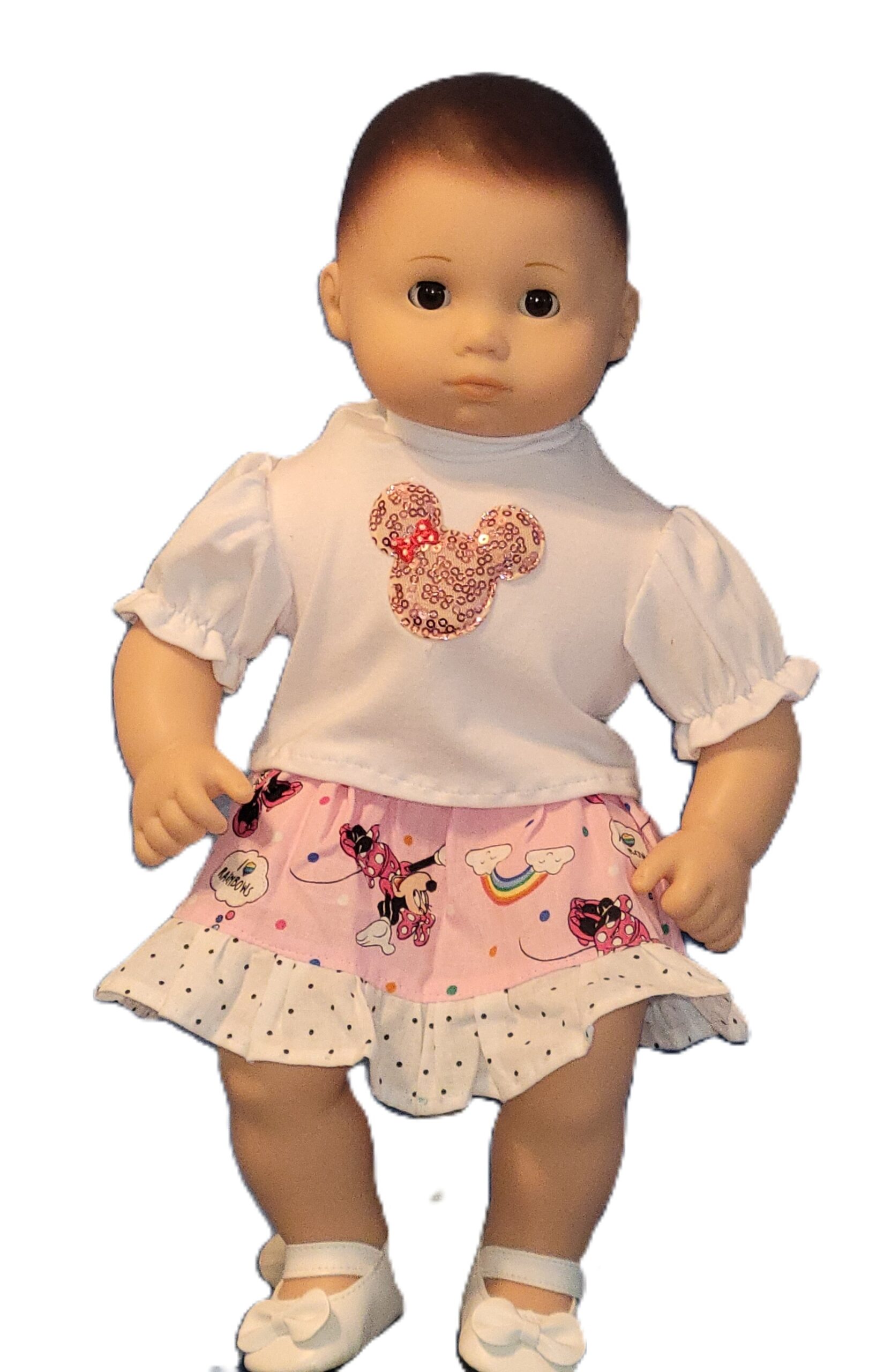This skirt and tee features everyone's favorite mouse. The white tee is embellished with a sequined mouse head applique. The skirt features a cute Minnie print with a polka dot ruffle.