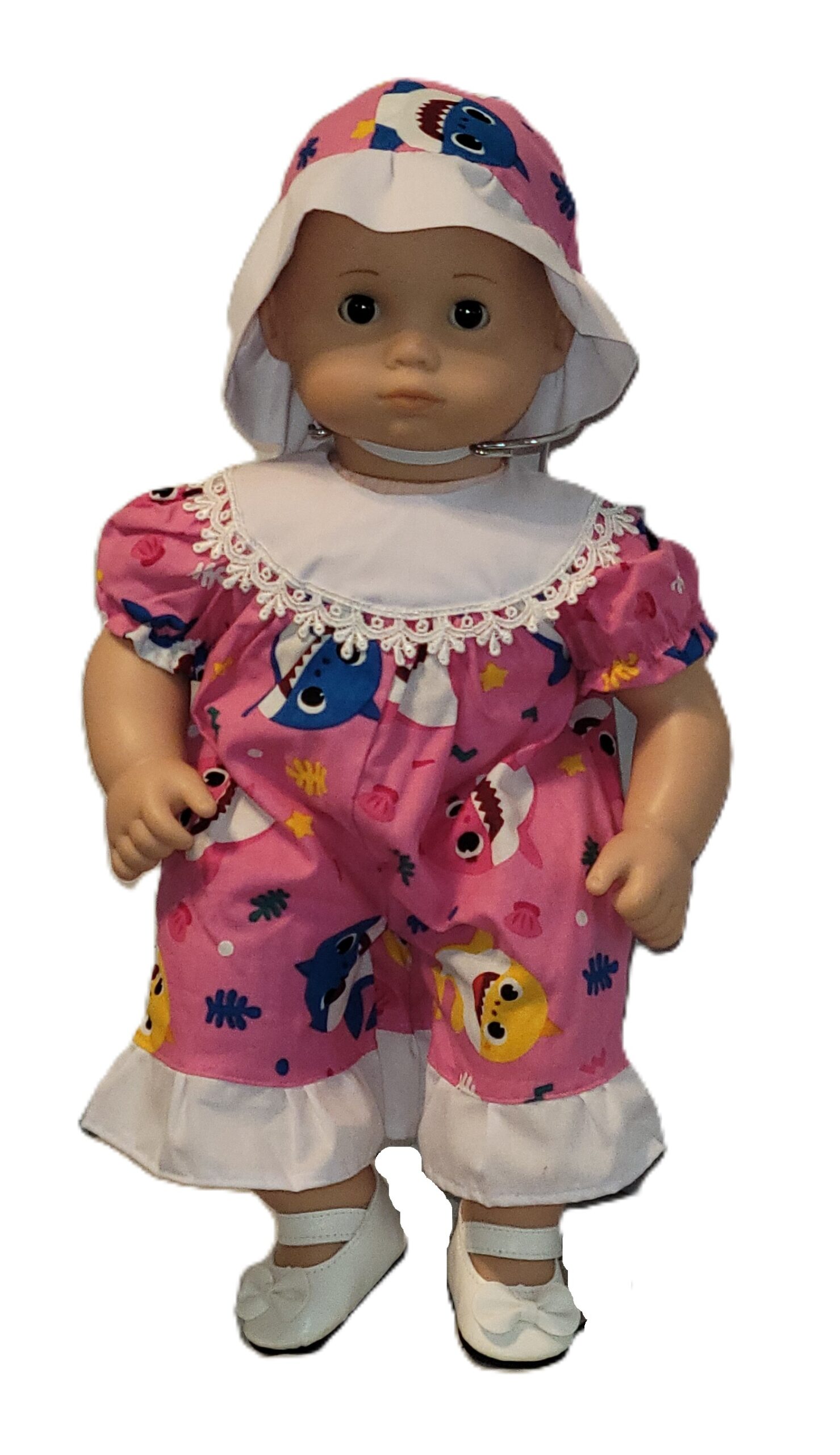Our beach romper and matching bucket hat in a Baby Shark print on a pink background with white ruffles. The romper also has cotton lace around the yoke.