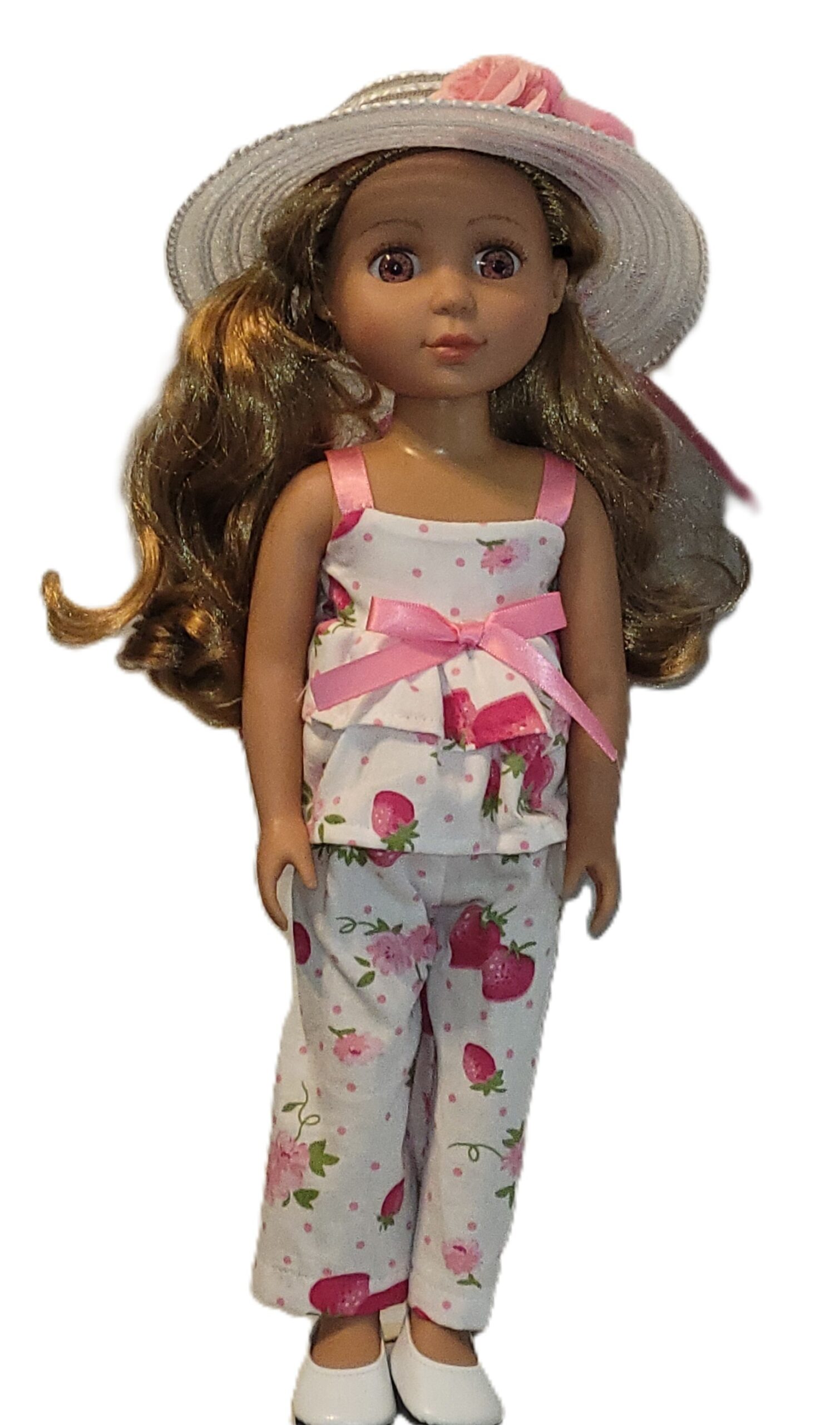 Strawberry fields forever. This summer outfit features elastic waist pants and a ruffled camisole top, both in a pink strawberry print. The white sunhat is trimmed with ribbon and flowers. Shoes sold separately.