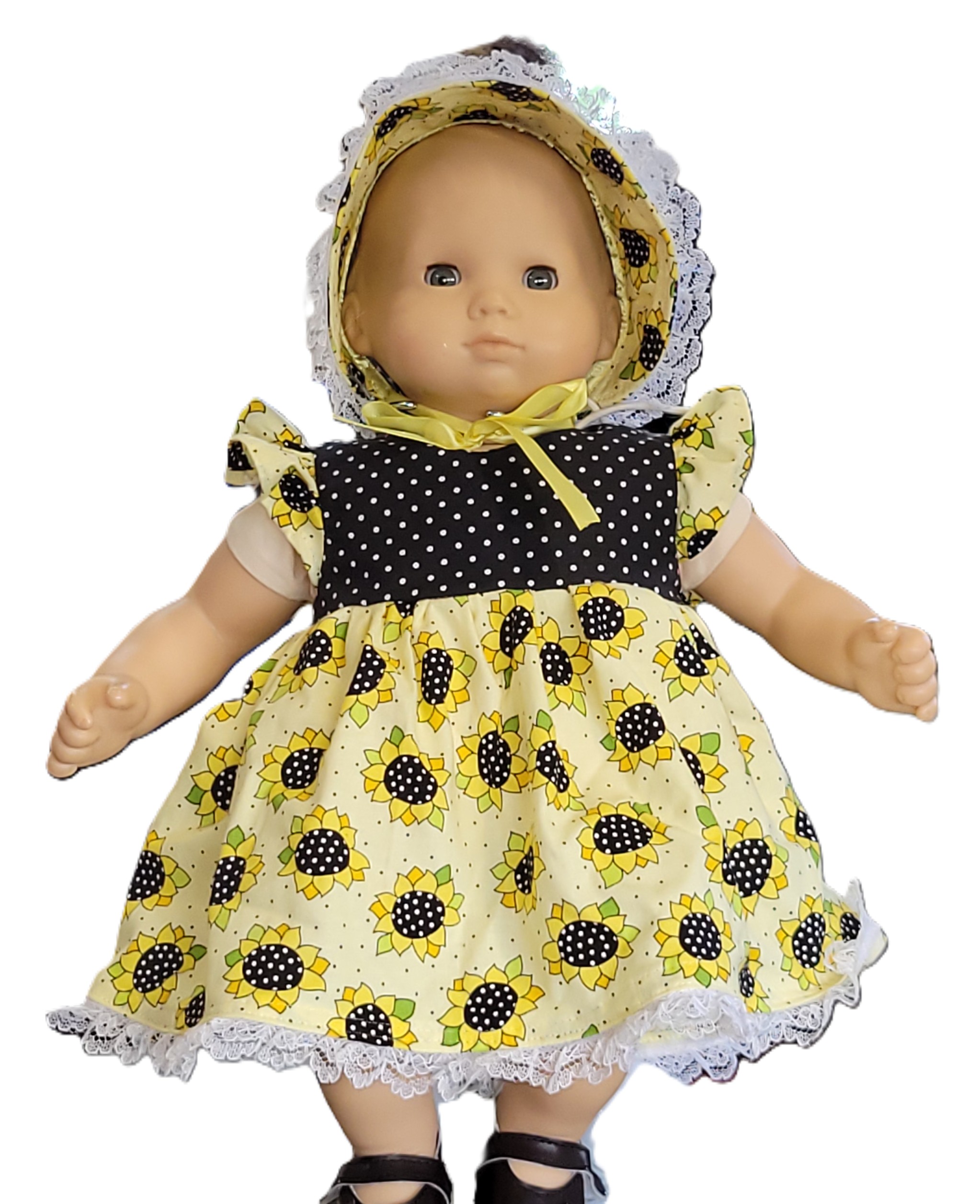 Your babydoll will look so sweet in this sunflower print dress and bonnet. The bodice and the bonnet crown are black and white polka dot, which matches the center of the sunflowers. Both are trimmed in white lace. Sweet and sunny, just like you!