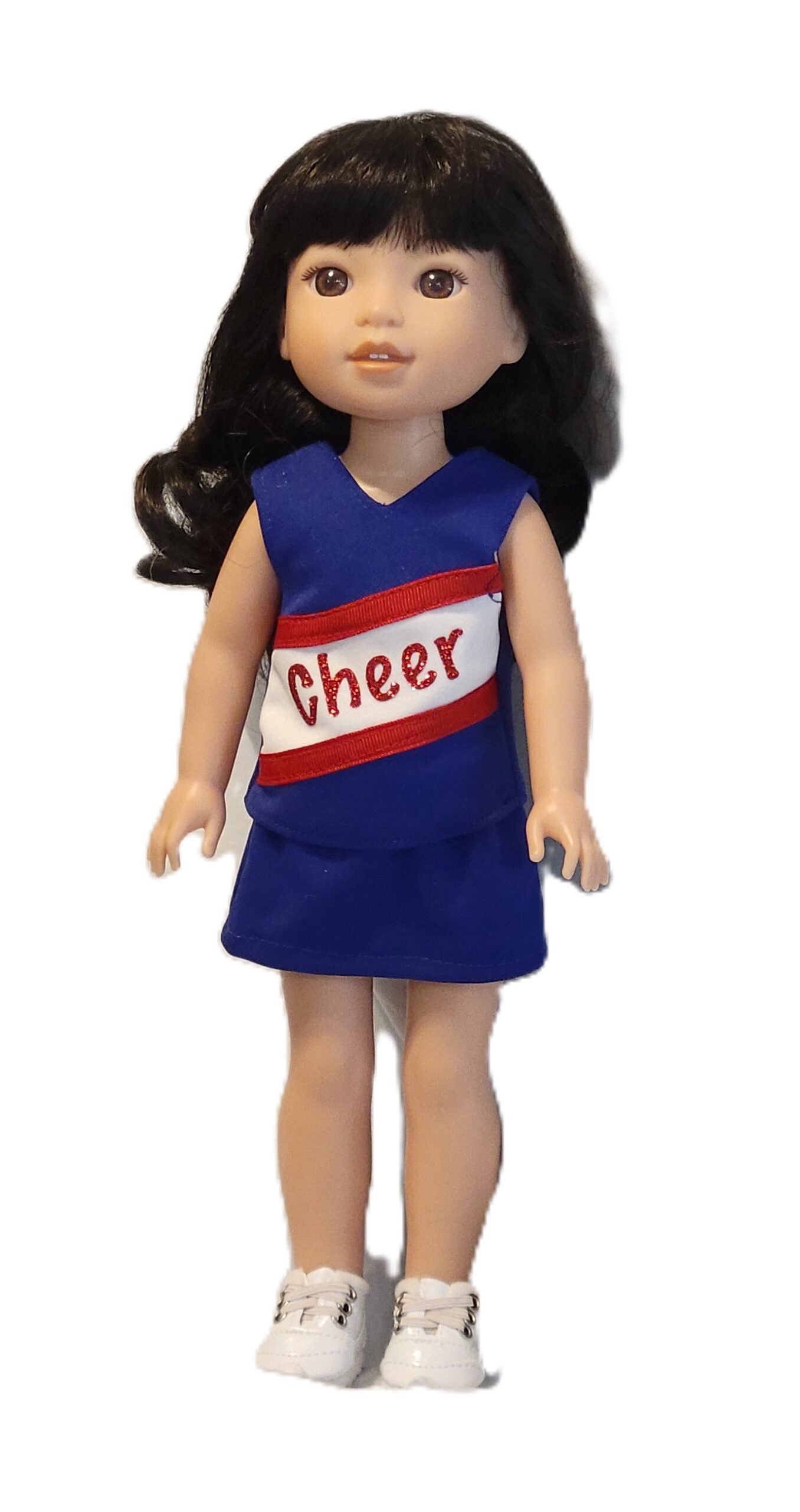 Go team! Our cheerleader for 14" dolls has a royal blue skirt and sleeveless top with a white inset trimmed in red ribbon and Cheer. The mylar poms are included and have elastic loops so your doll can hold them. Sneakers sold separately.
