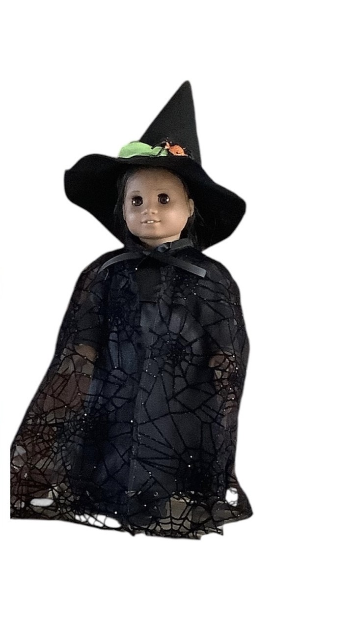 We promise she’s a good witch. Our traditional Halloween Witch costume features a long black satin dress with a spooky patterned organza cape and a black felt witch hat with an organza band.