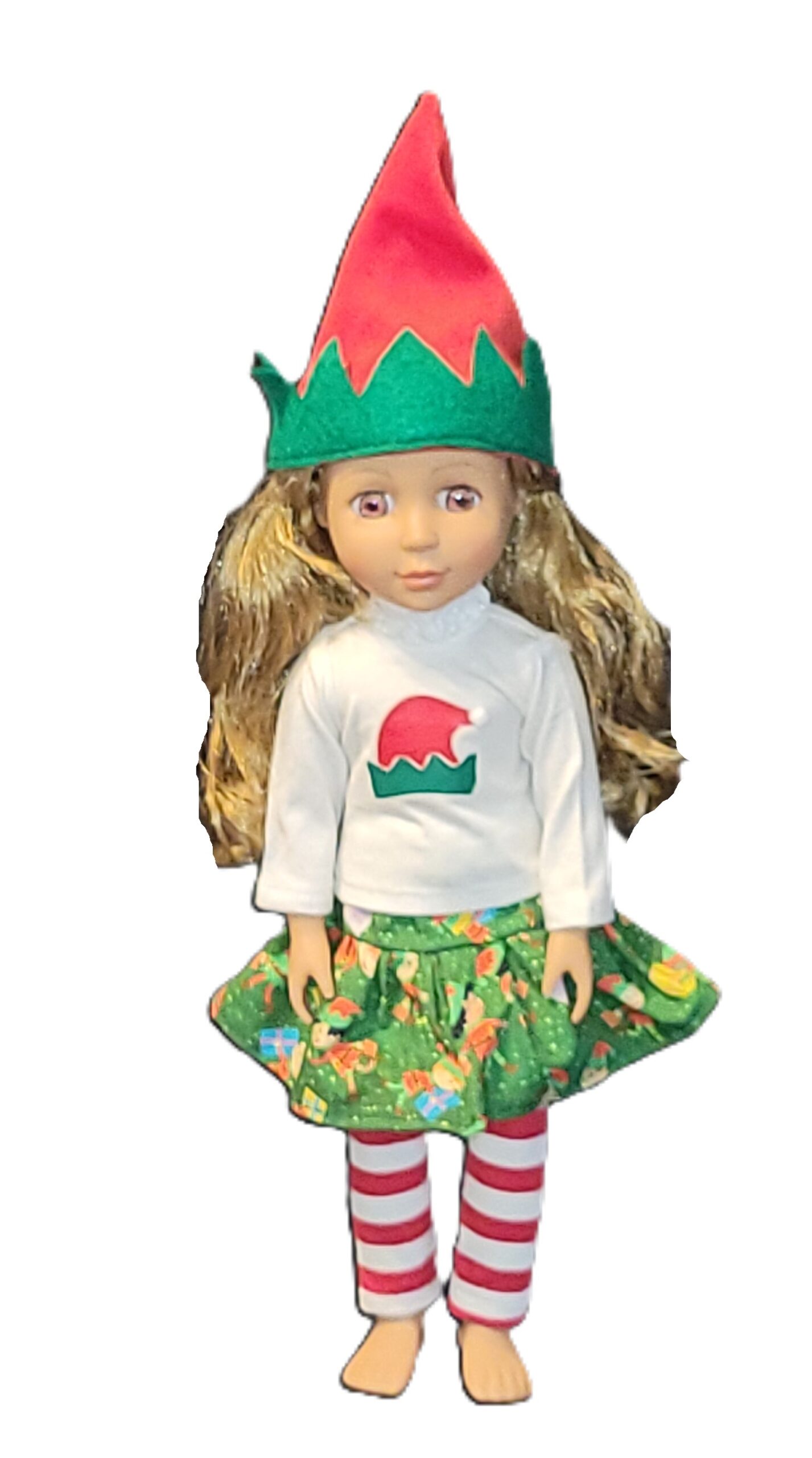 Our Wellie elf costume has striped leggings, and elf print skirt, a long sleeved tee with design, and an elf hat.